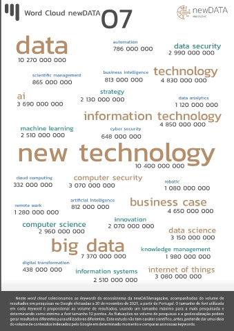 Neste word cloud colecionamos as keywords do ecossistema da newDATAmagazine, acompanhadas do volume de