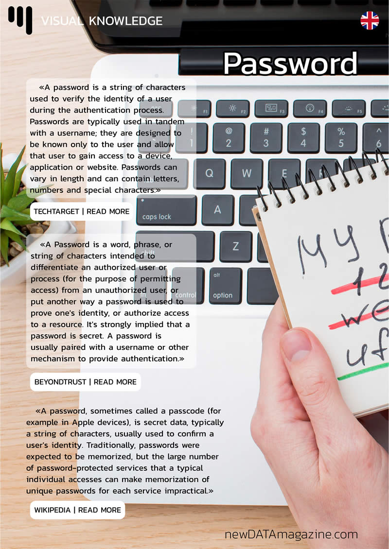 «Uma palavra-passe é uma cadeia de carateres utilizada para verificar a identidade de um utilizador durante o processo de autenticação. As palavras-passe são tipicamente utilizadas em conjunto com um nome de utilizador; são concebidas para serem conhecidas apenas pelo utilizador e permitem que este tenha acesso a um dispositivo, aplicação ou website. As palavras-passe podem variar em extensão e podem conter letras, números e carateres especiais.» |